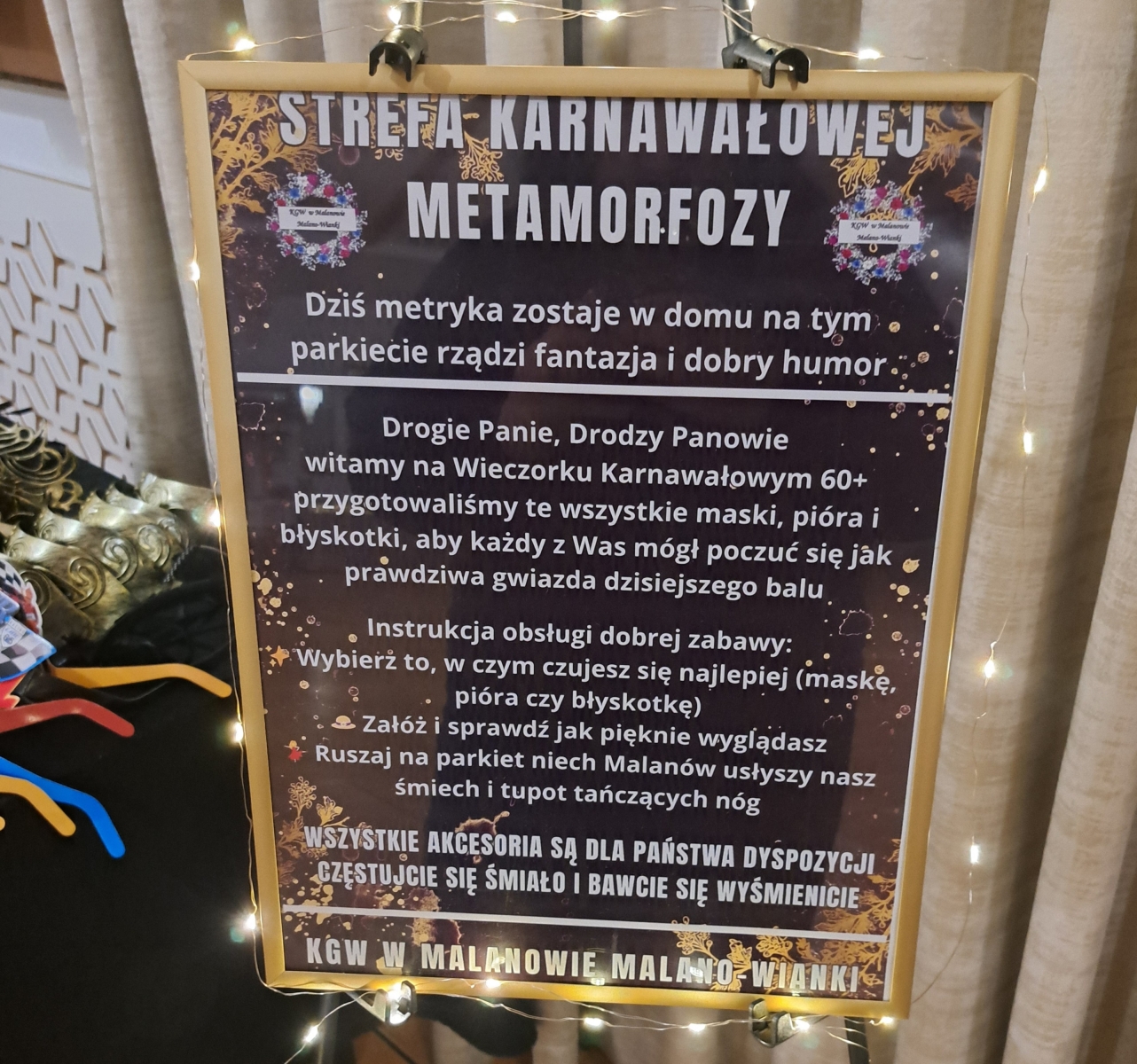 Koło Gospodyń Wiejskich Malano-wianki z ogromnym wzruszeniem i radością wraca myślami do naszego Wieczorku Karnawałowego 60+, który odbył się 13 lutego w Restauracji Vena. Przyświecało nam hasło: „Dziś metryka zostaje w domu, na parkiecie rządzi fantazja i dobry humor” i możemy śmiało powiedzieć, że zostało ono spełnione w stu procentach. Już od pierwszych chwil było widać, że nasi seniorzy i nie tylko potraktowali karnawał bardzo poważnie. Wielu Gości przyszło w pięknych, przemyślanych stylizacjach, a niektórzy pojawili się w pełnych przebraniach. Nie brakowało masek, piór, kapeluszy, cekinów i błyszczących dodatków. Sala mieniła się kolorami, a karnawałowy klimat czuć było w każdym zakątku. Z dumą obserwowałyśmy, jak nasi uczestnicy z uśmiechem podchodzili do „Strefy Karnawałowej Metamorfozy”, dobierali akcesoria i pozwalali sobie na odrobinę szaleństwa.
