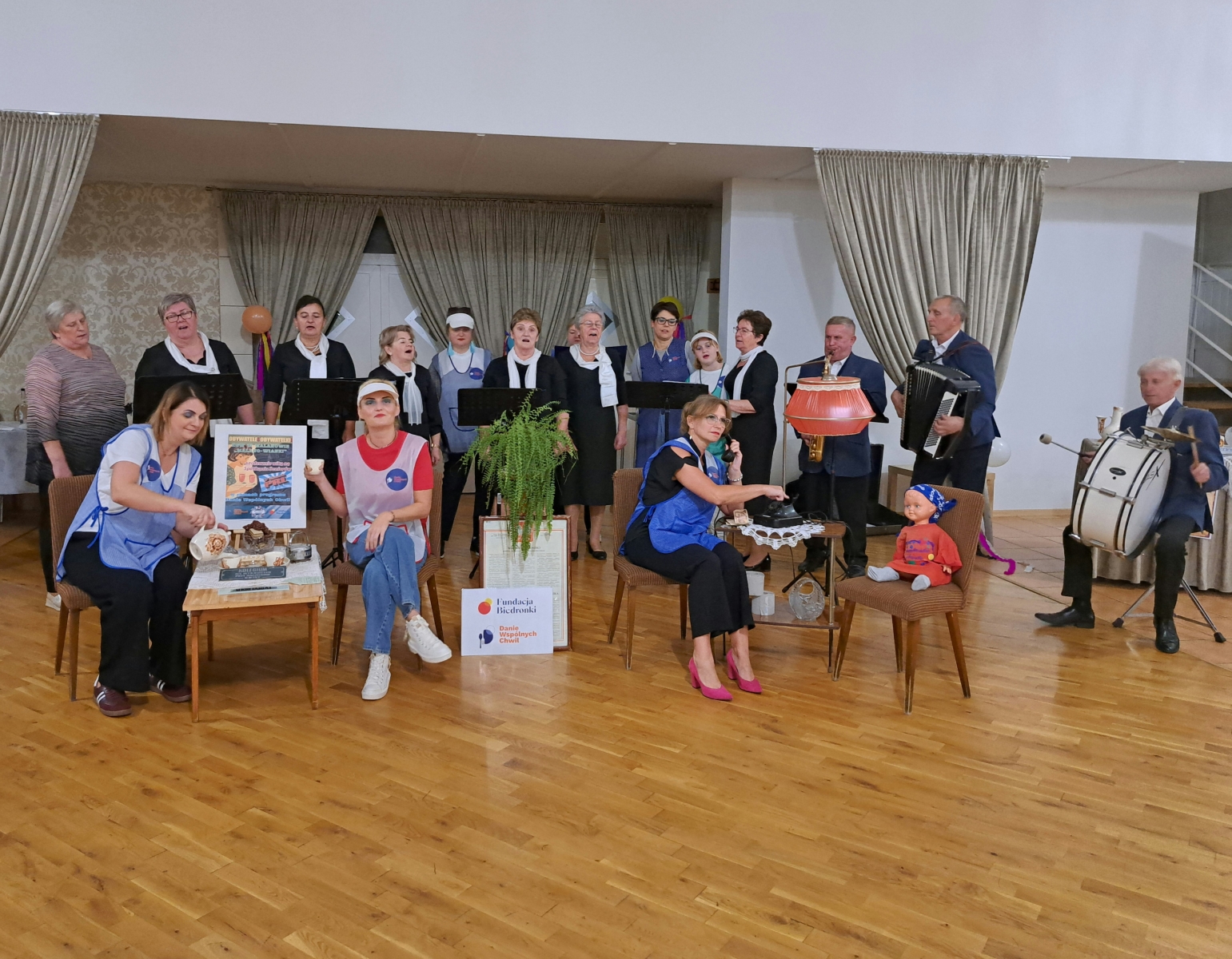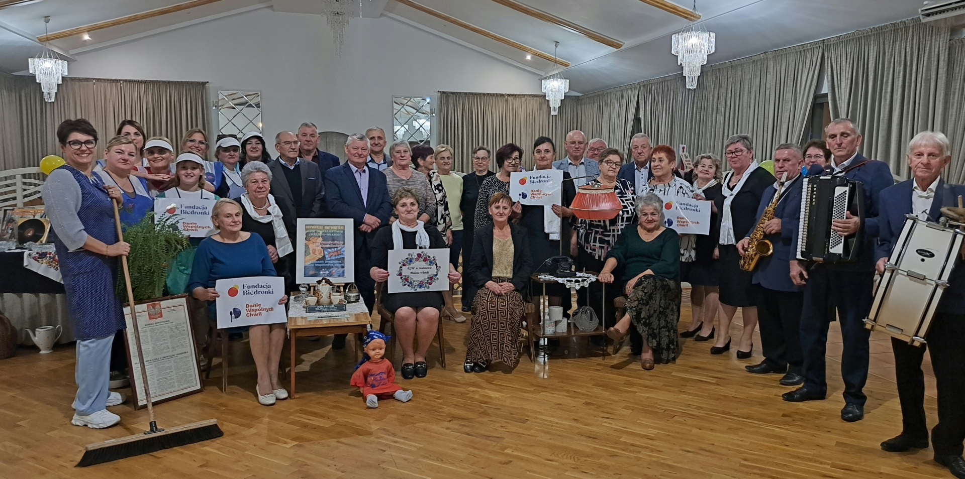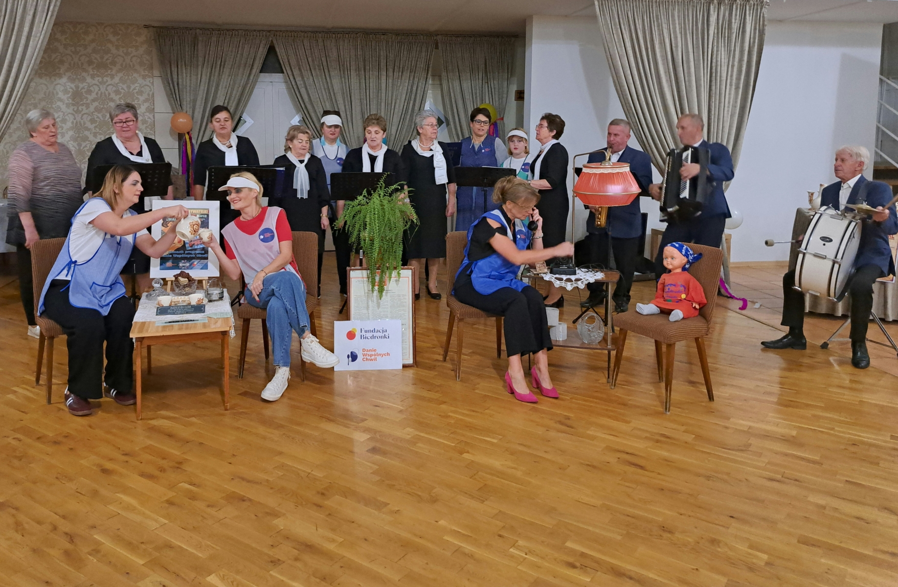 Nie zabrakło też wspólnej zabawy. Na parkiecie zorganizowaliśmy dancing w klimacie lat 70 i 80, przy muzyce charakterystycznej dla tamtych czasów. Była także muzyka na żywo, oprawę zapewnił Zespół Tradycja, z którym wspólnie z seniorami zaśpiewaliśmy piosenkę przygotowaną specjalnie na konkurs „Pokolenie na scenie” organizowany przez Fundację Biedronka.
