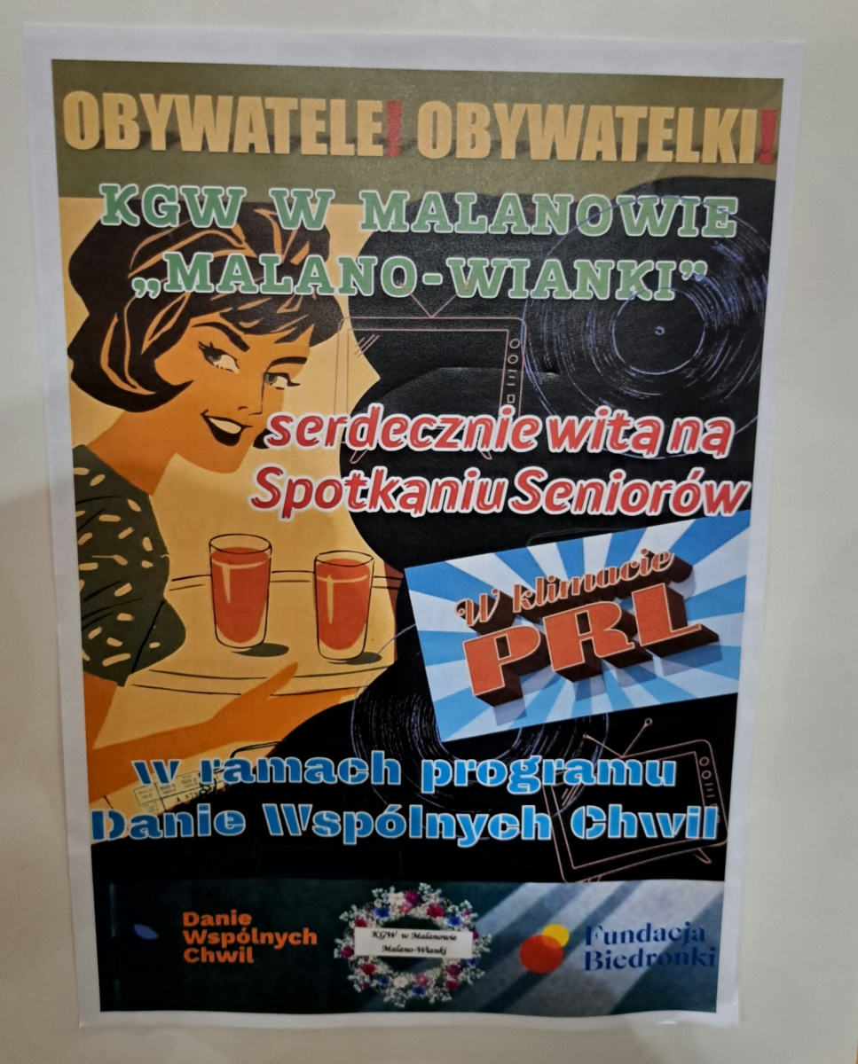 KGW Malano-Wianki w ubiegłą niedzielę 28.09.2025r. zorganizowało dla lokalnych seniorów spotkanie w ramach programu Danie Wspólnych Chwil Fundacji Biedronki. Tym razem przenieśliśmy naszych gości w barwny świat lat PRL-u.