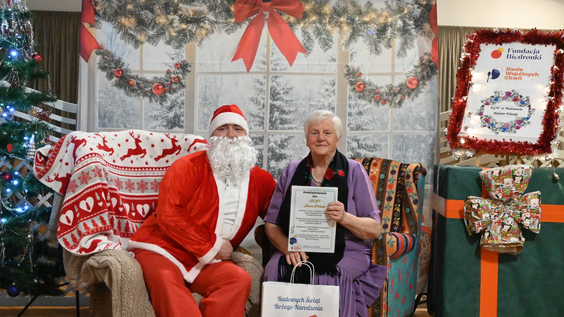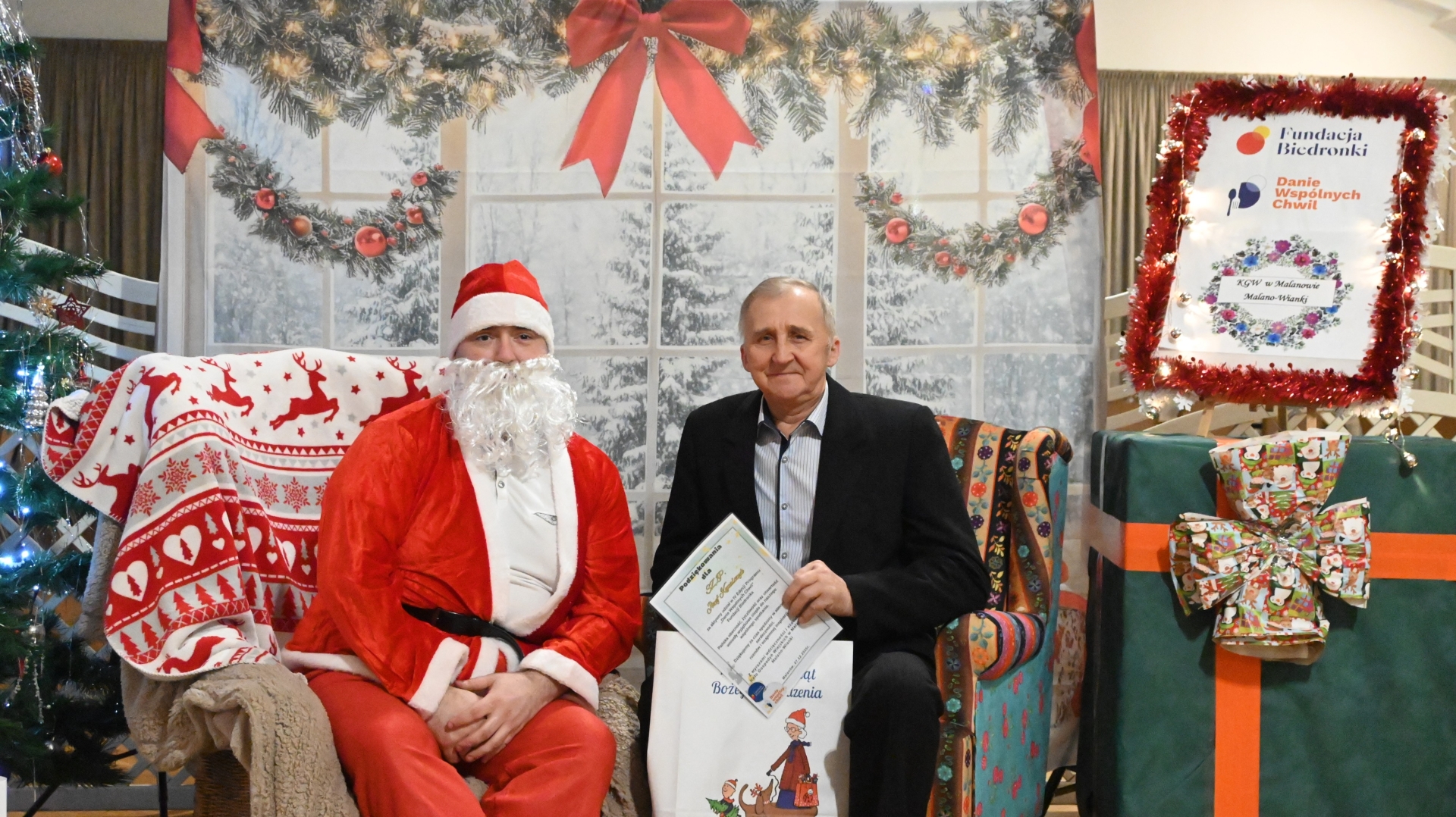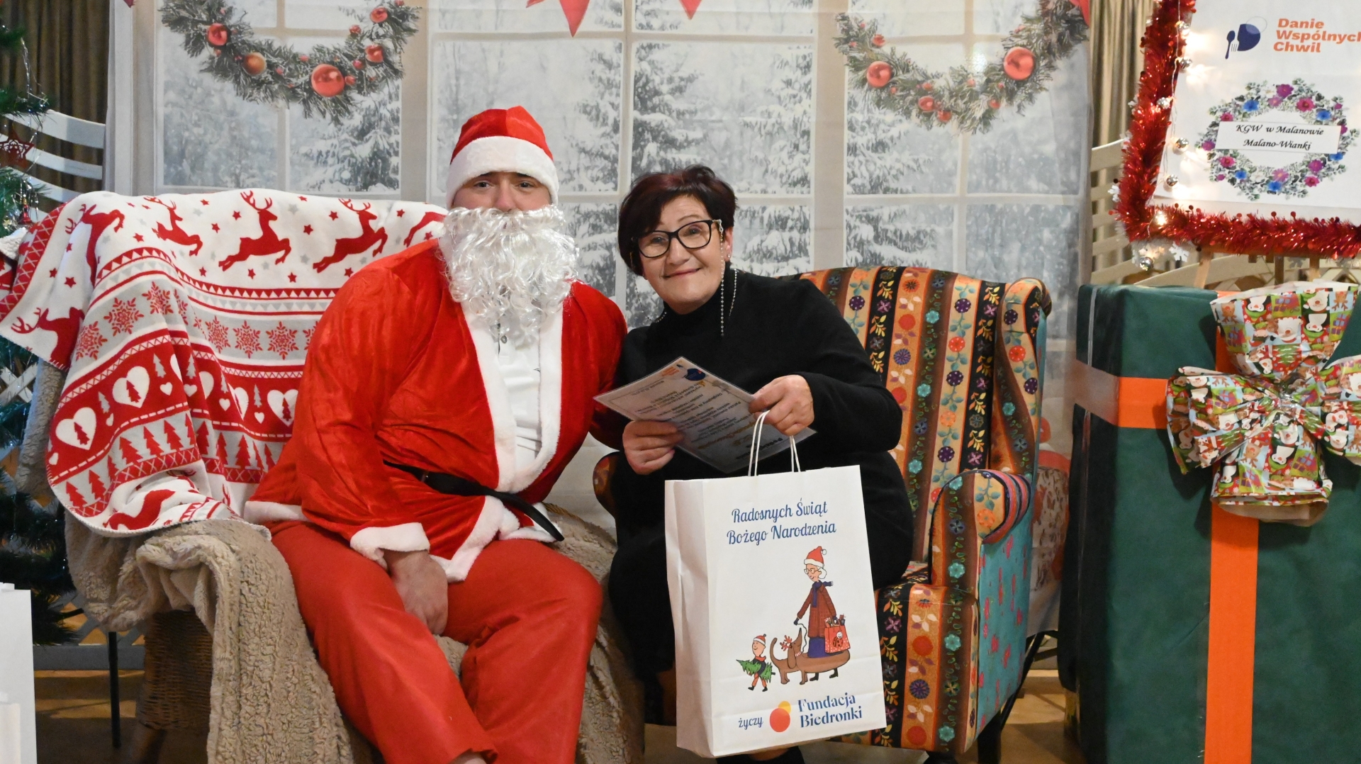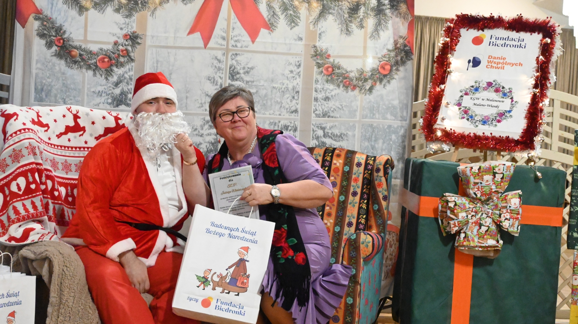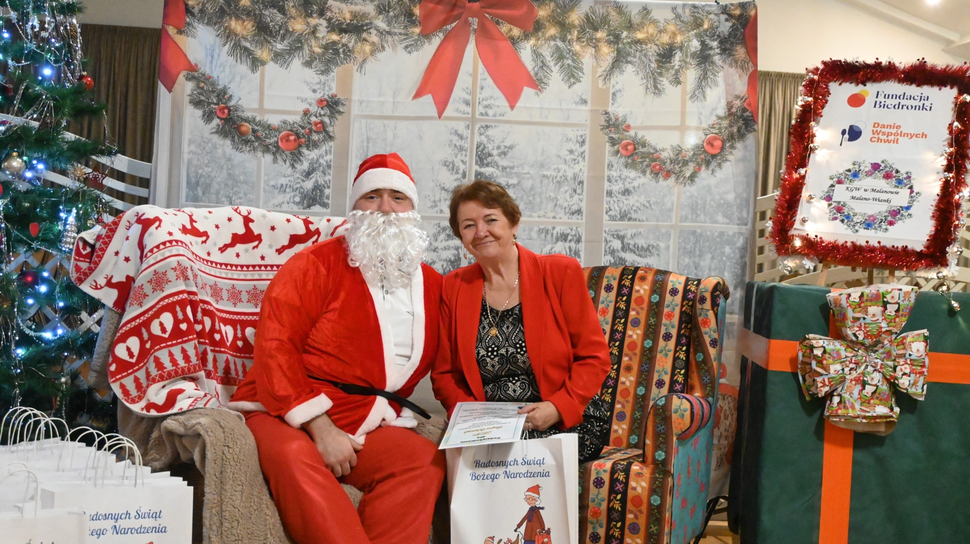 Nie mogło zabraknąć również wyjątkowego gościa Świętego Mikołaja, który dostarczył uczestnikom wiele uśmiechu i wzruszeń. To właśnie on wręczył upominki przygotowane przez Fundację Biedronka, zarówno seniorom, jak i członkom Koła Gospodyń Wiejskich Malano-Wianki.