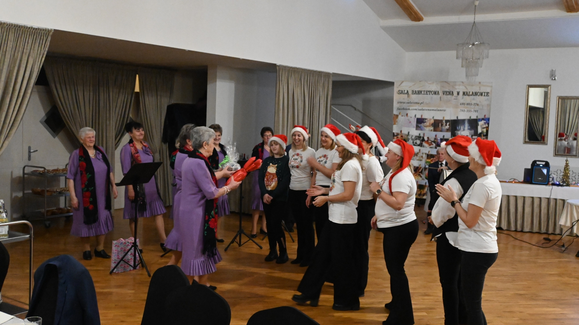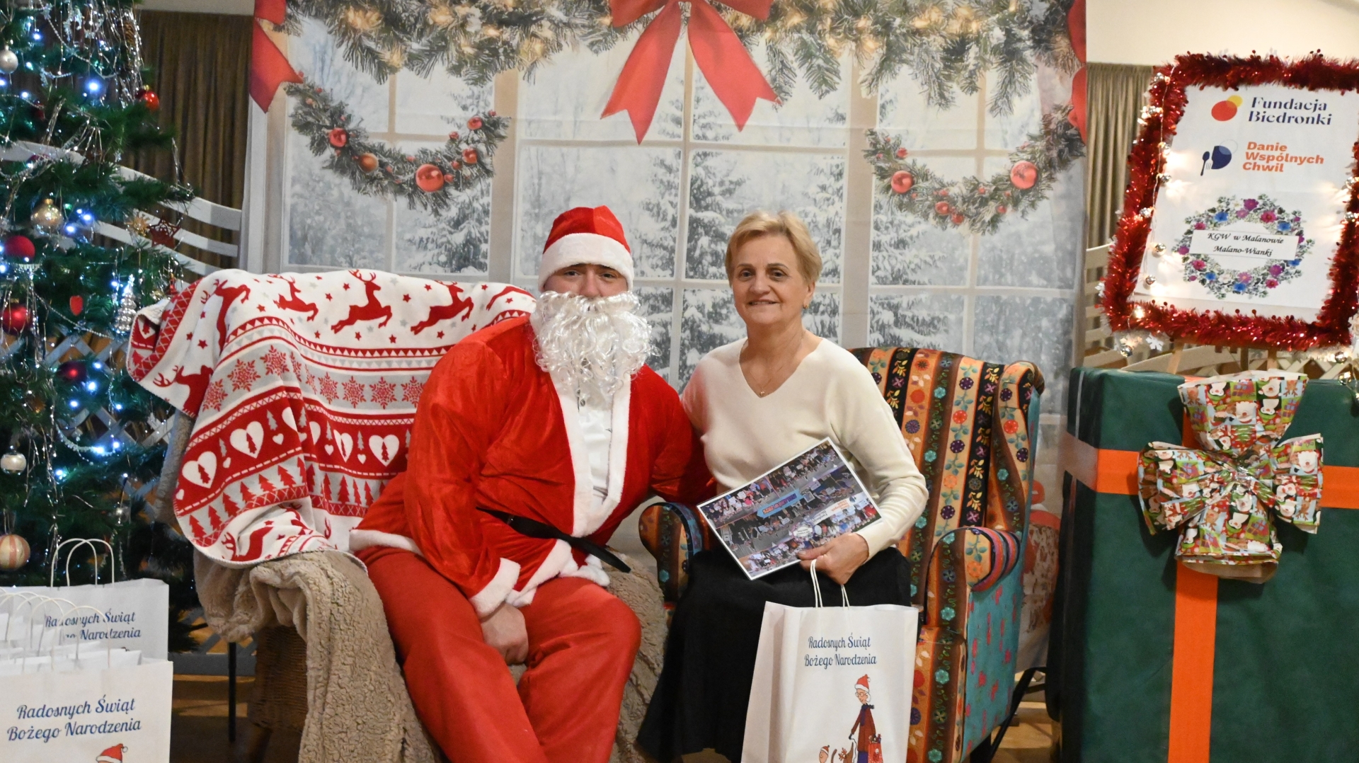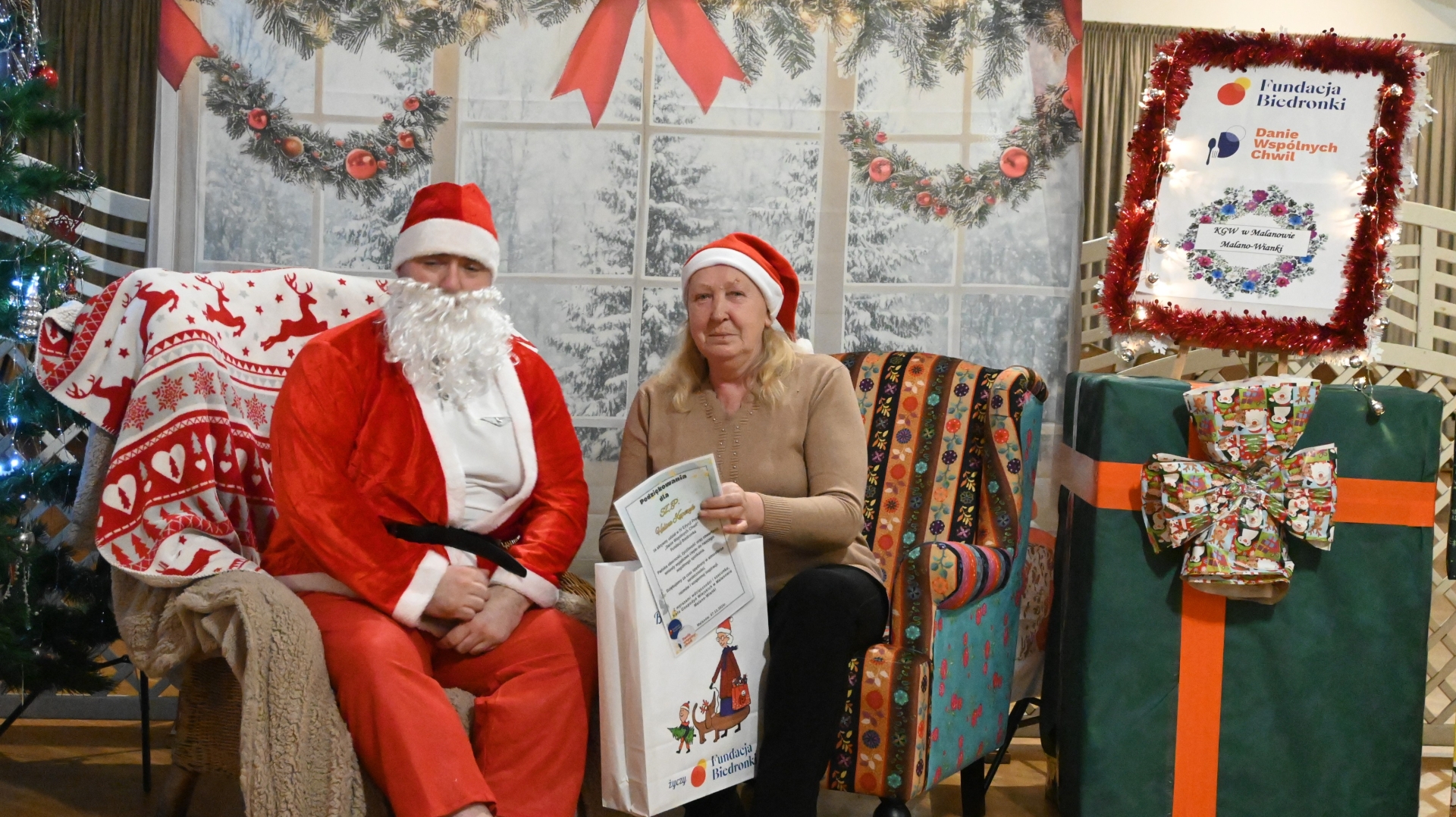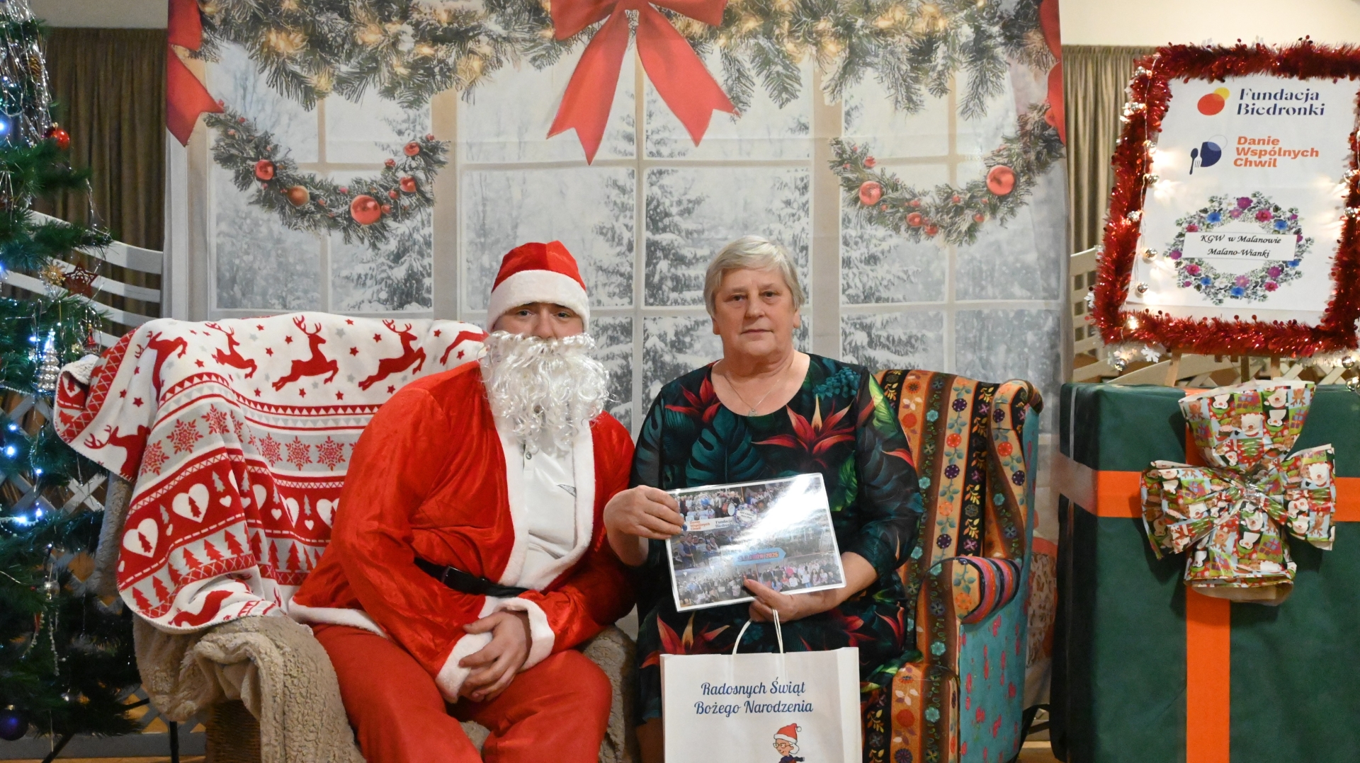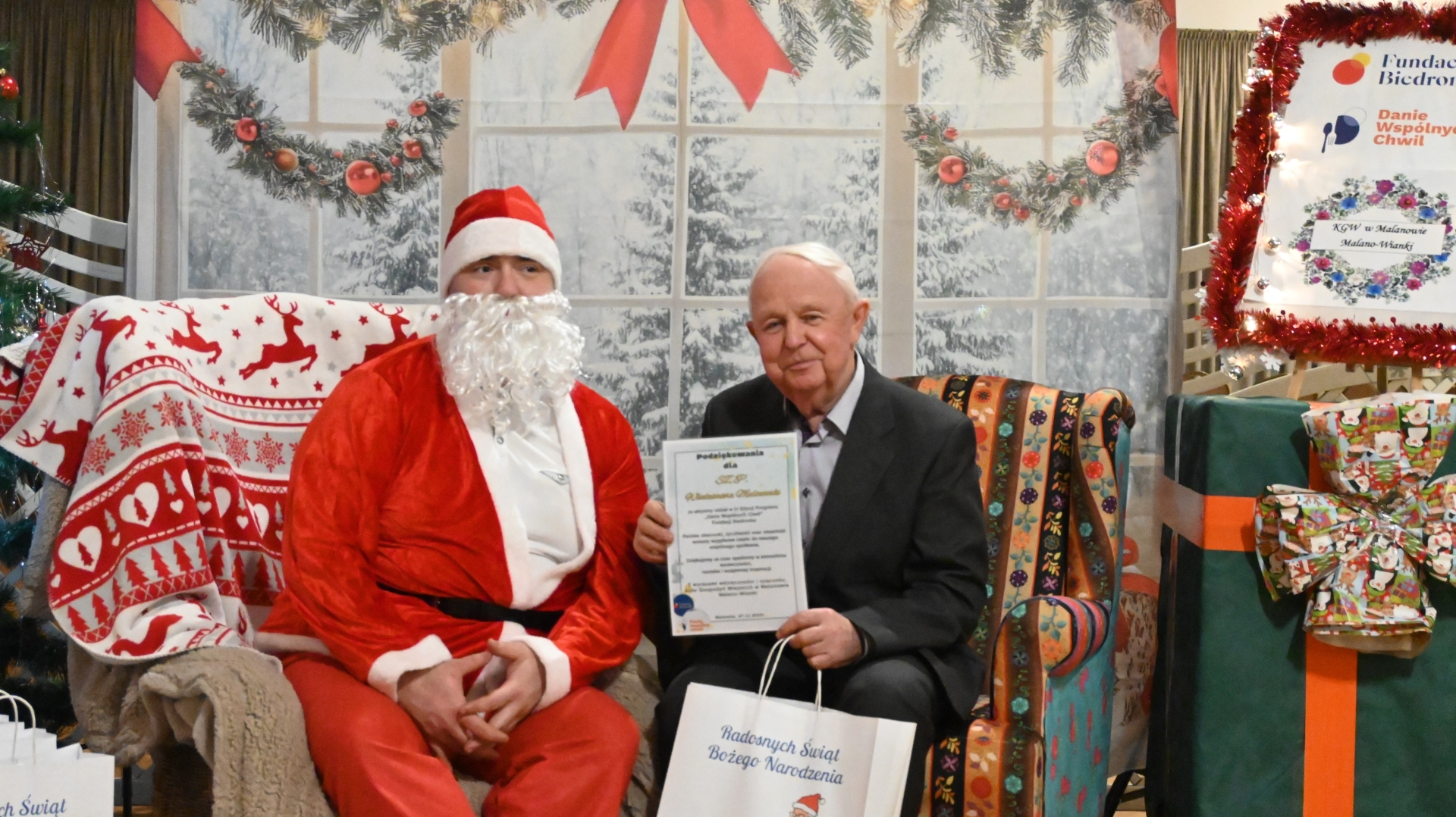 Nie mogło zabraknąć również wyjątkowego gościa Świętego Mikołaja, który dostarczył uczestnikom wiele uśmiechu i wzruszeń. To właśnie on wręczył upominki przygotowane przez Fundację Biedronka, zarówno seniorom, jak i członkom Koła Gospodyń Wiejskich Malano-Wianki.