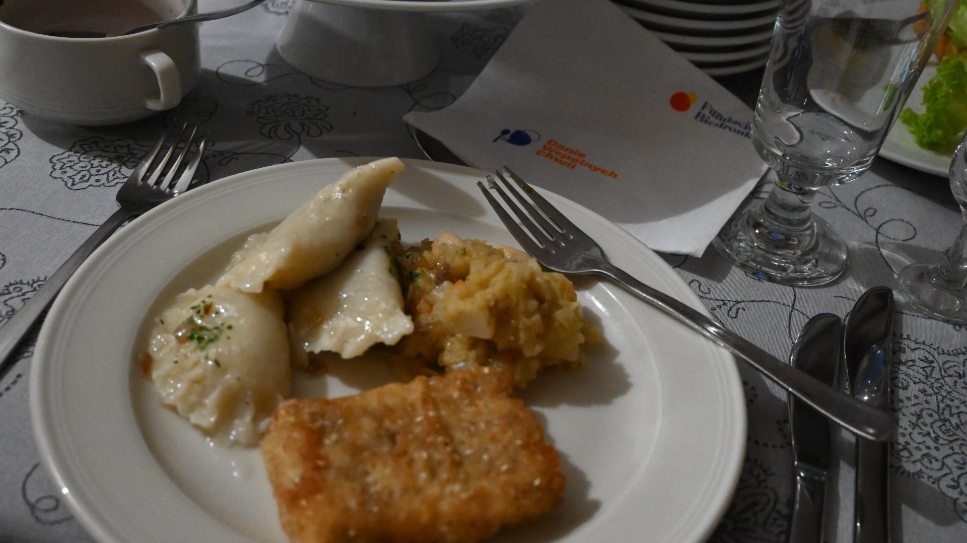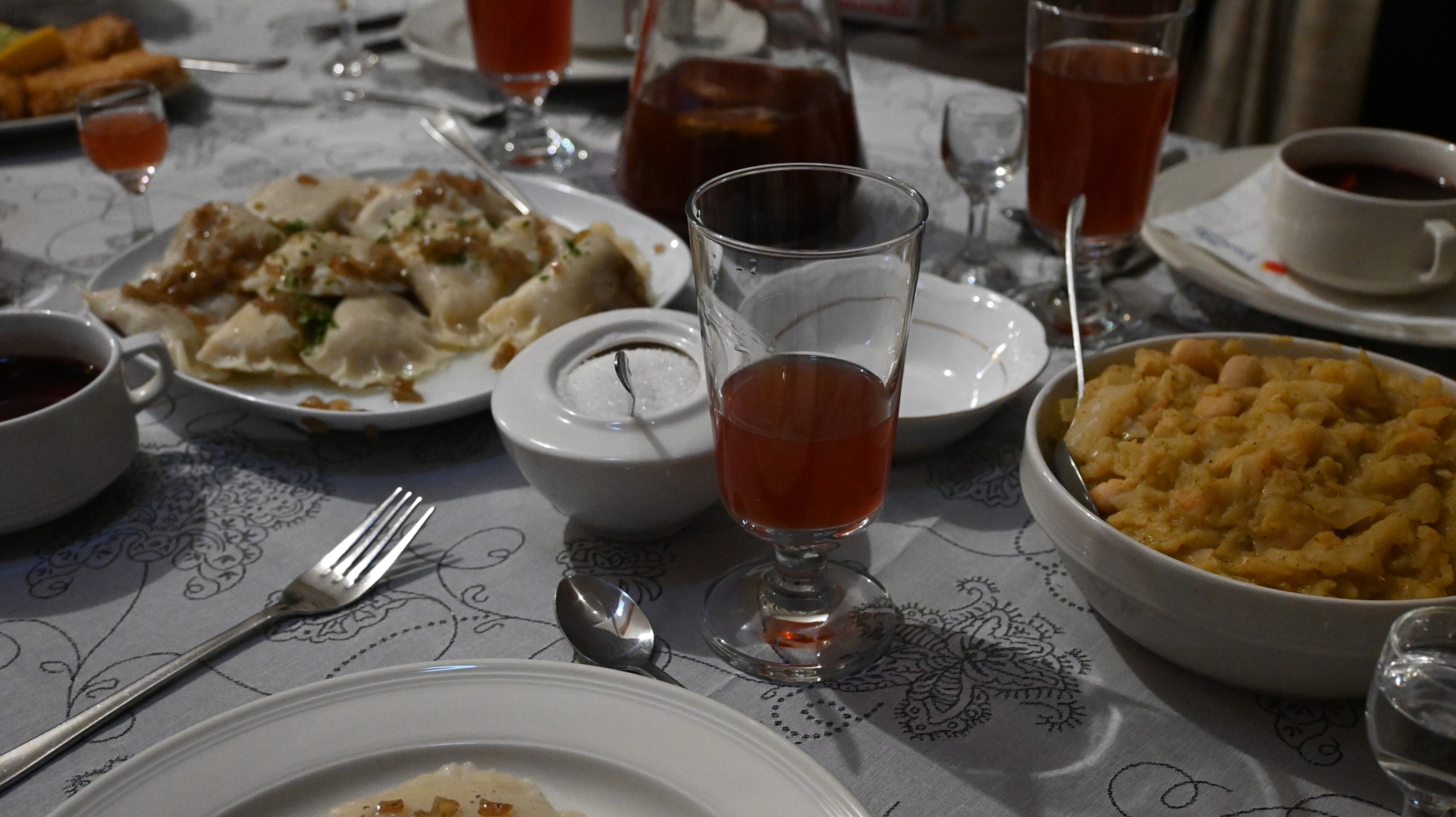 Na stołach królowały:czerwony barszcz z uszkami, ryby, sałatka śledziowa, kapusta wigilijna, pierogi z kapustą i grzybami. Do picia serwowaliśmy aromatyczny kompot z suszu, a całość wieńczyły smakowite świąteczne ciasta, makowiec oraz pierniczki, które idealnie dopełniły atmosferę grudniowego spotkania.